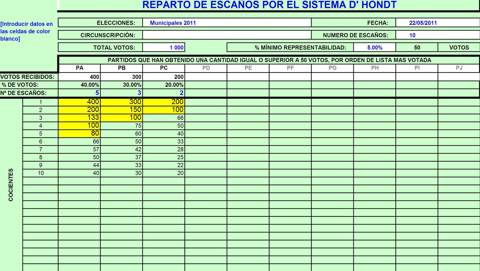 La aplicación Excel siguiente sirve para simular, calcular el reparto de escaños y analizar el resultado de un proceso electoral determinado. Admite datos hasta diez partidos con representabilidad y 400 escaños.